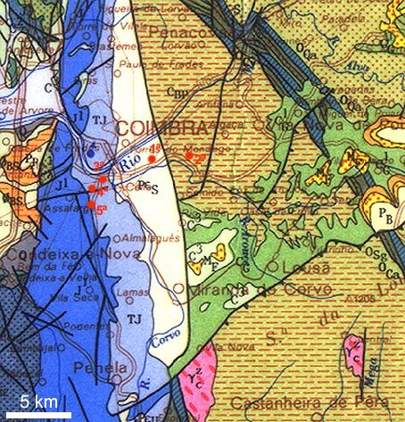 A passagem com o rato sobre as principais formações mostrará a legenda das mesmas, conforme consta da carta geológica (escala 1:500 000, 1992, IGM). Os números assinalam o local exacto das paragens correspondentes.