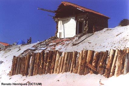 Efeitos dos temporais no Inverno de 1995, com destruição de um palheiro (casa típica desta praia). Local: Pedrinhas, Viana do Castelo.